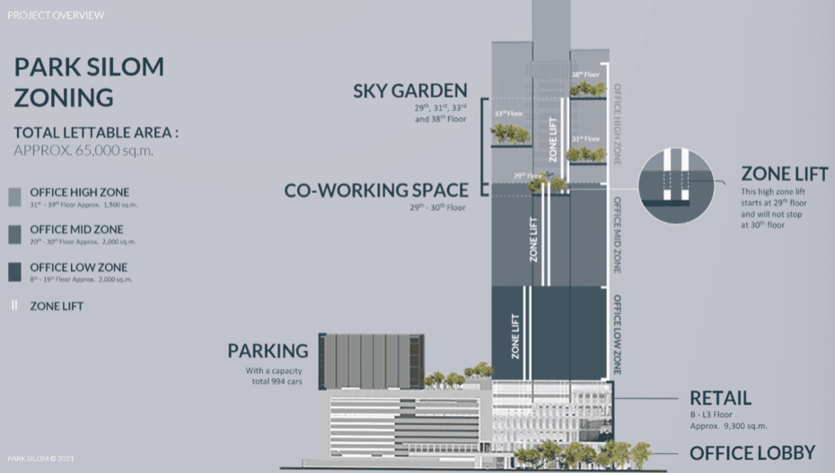 Park Silom มีความสูงทั้งหมด 39 ชั้น และมีพื้นที่สำนักงานรวม 56,000 ตารางเมตร โดยภาพรวมของสิ่งที่เป็นจุดเด่นของอาคาร Park Silom ซึ่งทาง Bangkokofficefinder อยากจะ Highlight สำหรับบริษัทหรือผู้เช่าที่สนใจในอาคารแห่งนี้ มีดังต่อไปนี้